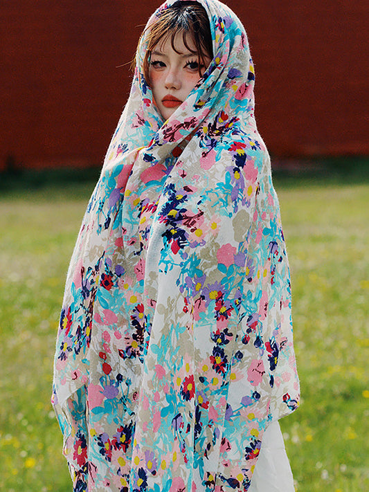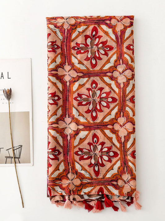 وشاح نسائي مزين بشراشيب بتصميم فني زهري للسفر