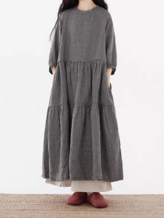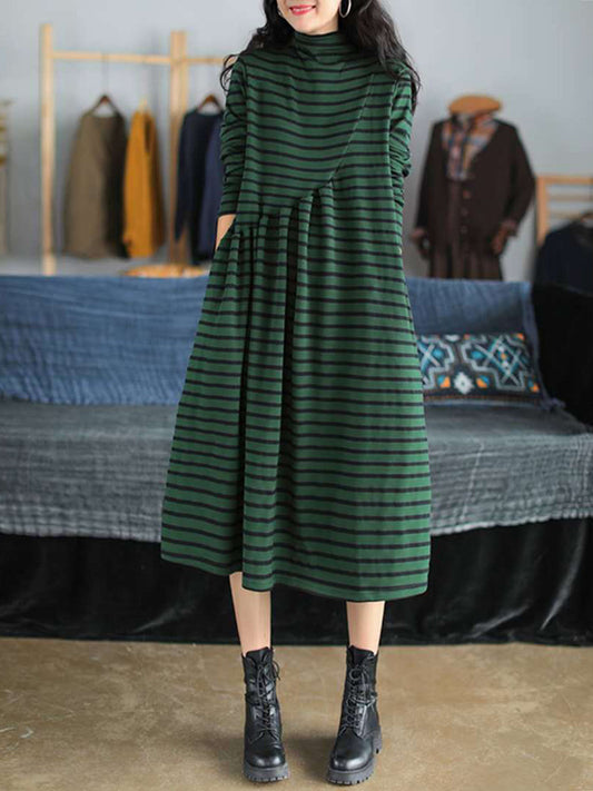 فستان نسائي مخطط من القطن بياقة مدورة مناسب لفصل الخريف بمقاسات كبيرة