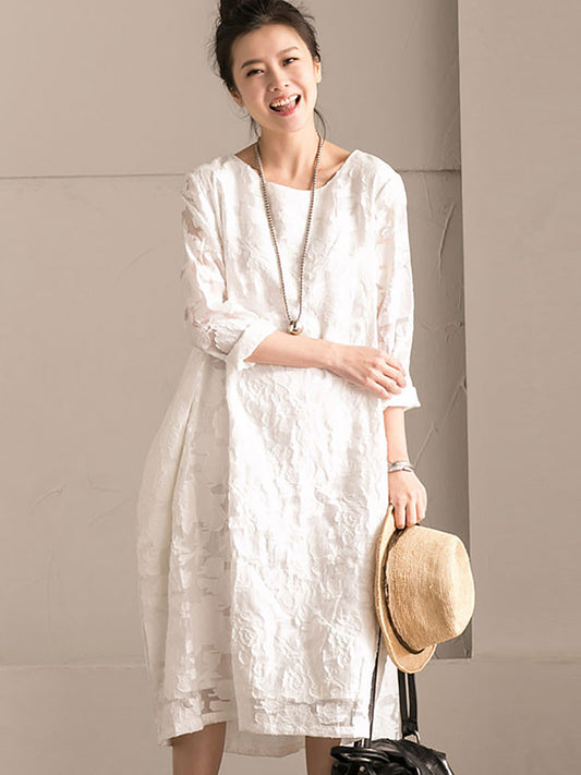 بالإضافة إلى حجم المرأة الخريف الصلبة الدانتيل فستان زهري أبيض