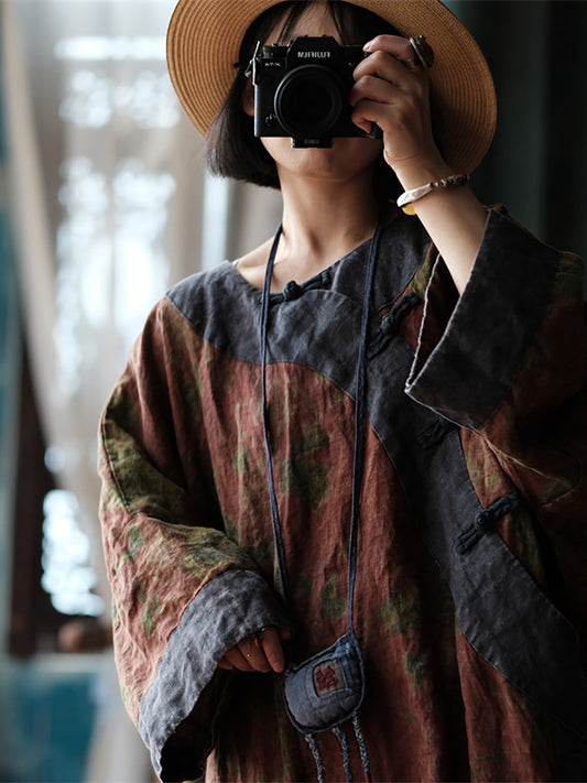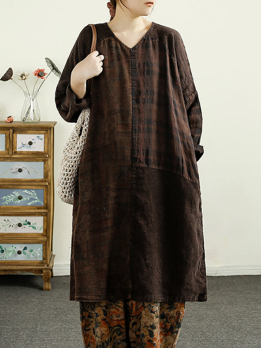 فستان نسائي فضفاض من الكتان بفتحة رقبة على شكل حرف V من الخريف