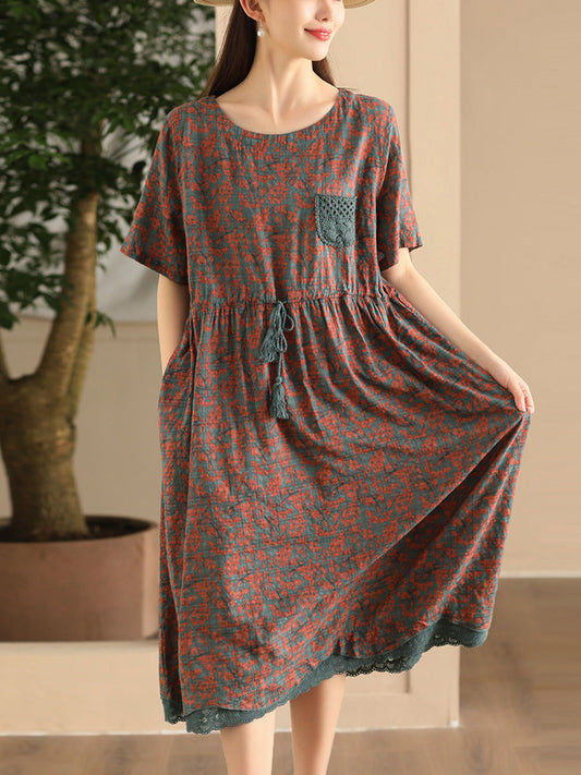 فستان نسائي من القطن والكتان بياقة دائرية وحزام متقاطع مزين بنقشة الزهور