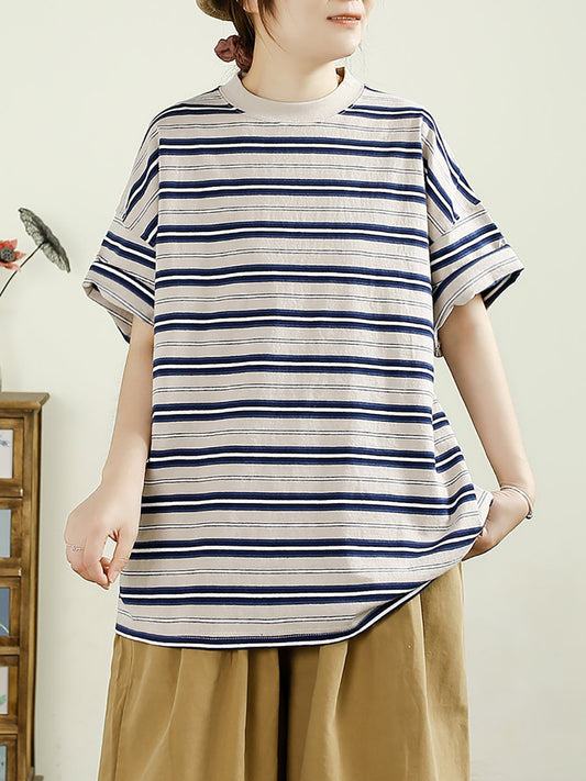 قميص نسائي صيفي كاجوال مخطط برقبة دائرية من القطن