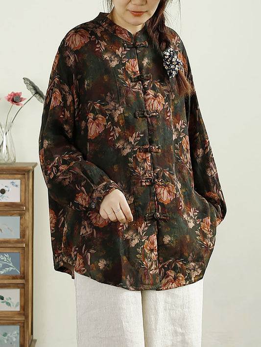 قميص نسائي من القطن بياقة واقفة وأزرار مزين بنقشة زهور الخريف