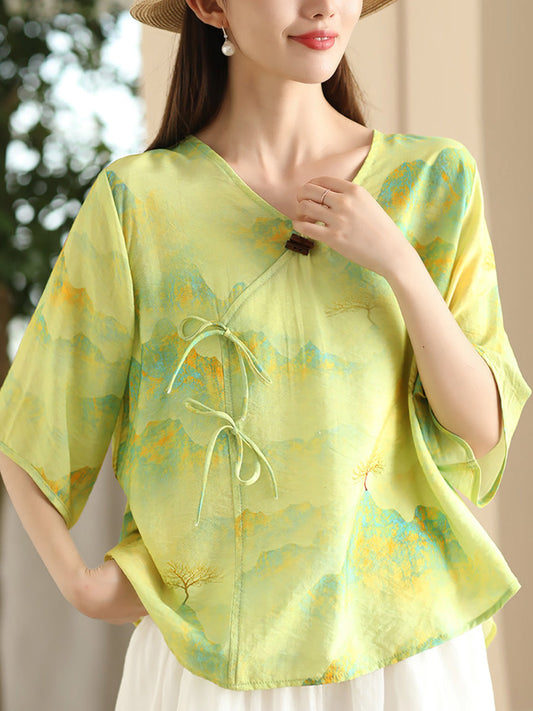 قميص نسائي صيفي فضفاض بطبعة عتيقة وفتحة رقبة على شكل حرف V