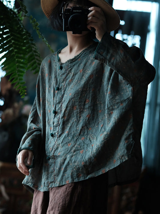 قميص نسائي من الكتان بنسبة 100% بفتحة رقبة على شكل حرف V مزين بزهور عتيقة