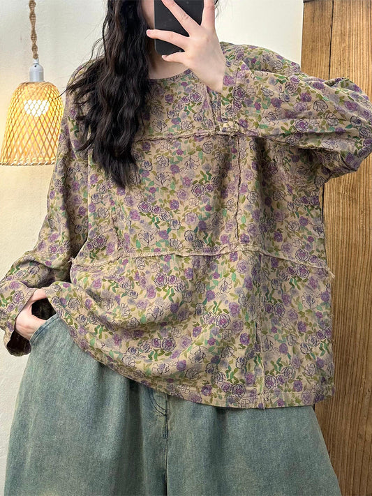 قميص نسائي من قماش الرامي بطبعة زهور عتيقة وفتحة رقبة دائرية