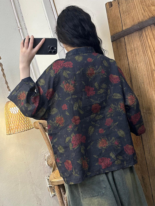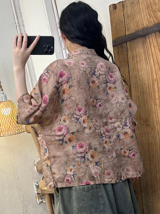 قميص نسائي صيفي من الكتان بأزرار مزين بزهور عرقية