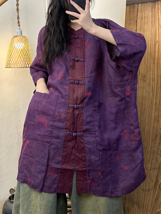 قميص نسائي صيفي من الكتان الرقيق بأزرار مصبوغة بالربط