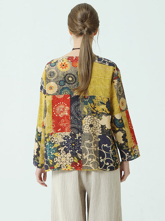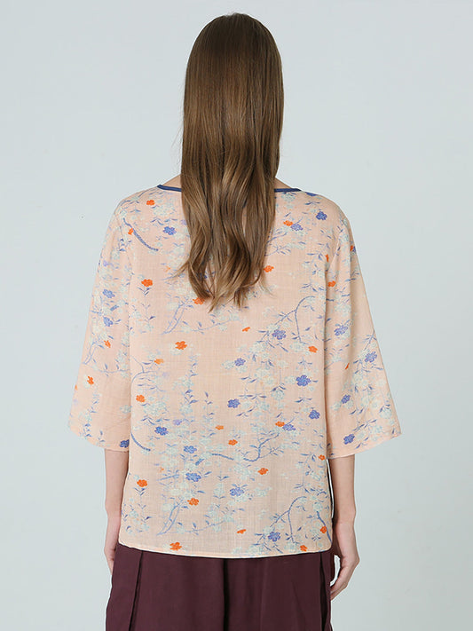 قميص عتيق غير منتظم من القطن والكتان بنقشة زهور مقاس كبير