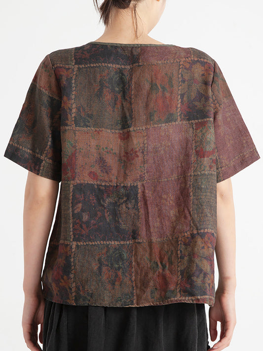 قميص نسائي فضفاض من الكتان بمقاس كبير صيفي منقوش بنقشة مربعات عتيقة