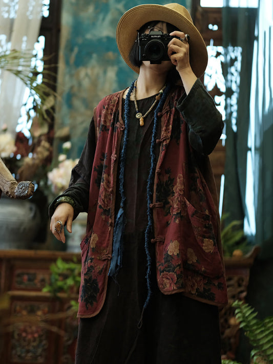 سترة نسائية من الكتان ذات حواف غير مزخرفة بنقشة أزهار عتيقة