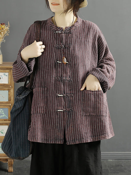 قميص نسائي ربيعي فضفاض من القطن والكتان بخطوط عرقية