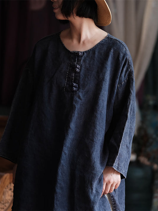 قميص نسائي فضفاض من الكتان الربيعي ذو رقبة دائرية