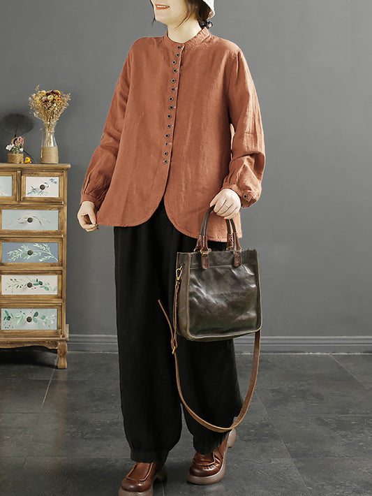 قميص نسائي كاجوال من الكتان بخياطة ربيعية سادة