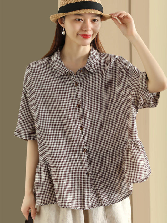 قميص نسائي ربيعي فضفاض من الكتان بنقشة مربعات كلاسيكية