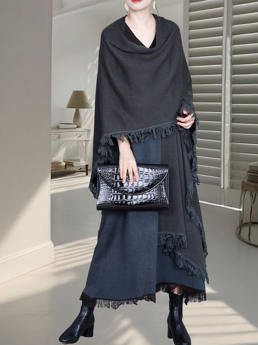 Women Fashion Colorblock Tassel Wool Knit Cardigan Shawl