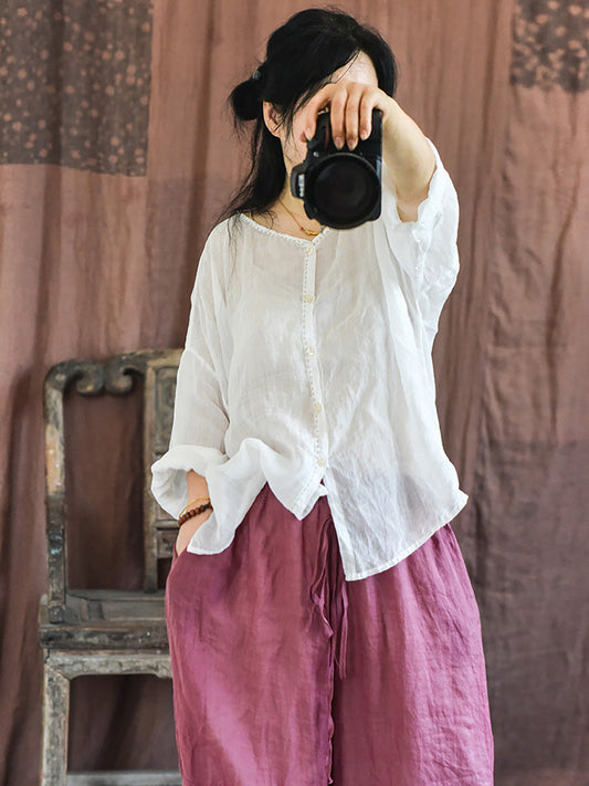 Women Vintage Solid Spring Linen O-Neck Loose Shirt