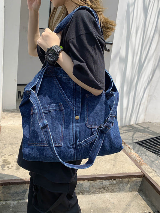 Women Vintage Solid Pocket Denim Handbag Shoulder Bag