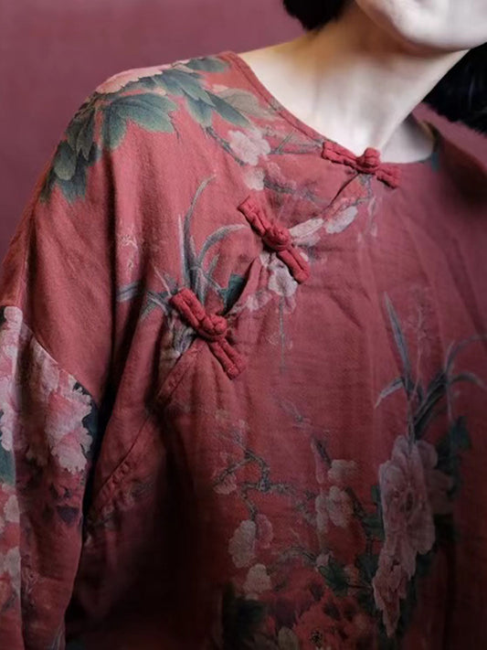 Plus Size Ramie Floral Vintage Women Summer Loose Dress