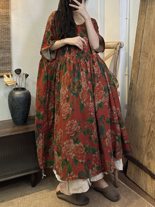 Plus Size Women Summer Vintage Floral Pleat Loose Dress