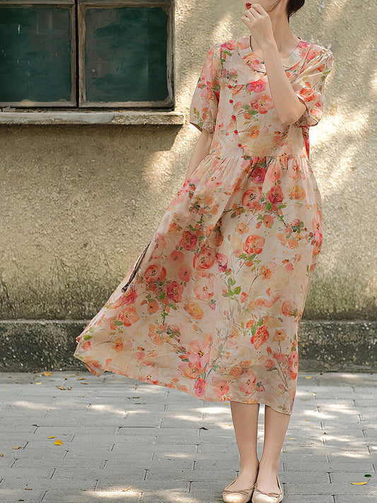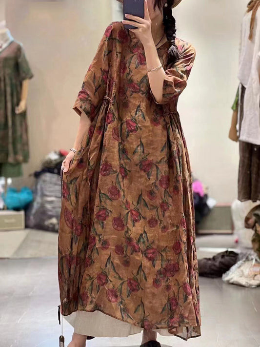 Plus Size Women Vintage Summer Floral Button Loose Ramie Dress