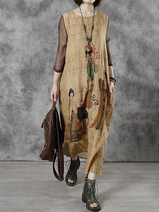 Plus Size Women Rerto Summer Print Loose Travel Ramie Dress