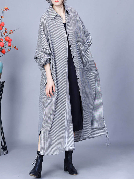 Women Casual Stripe Cotton Linen Loose Long Coat