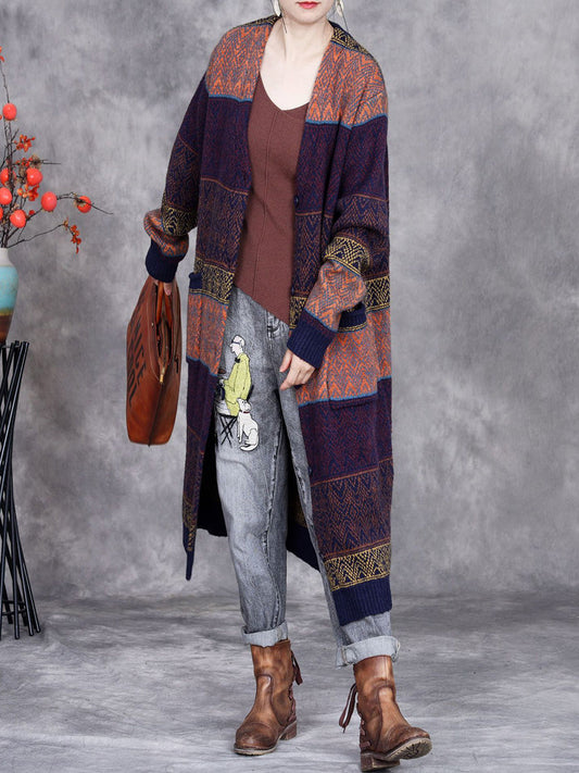 Women Winter Colorblock Wool Vintage Knitted Cardigan Coat