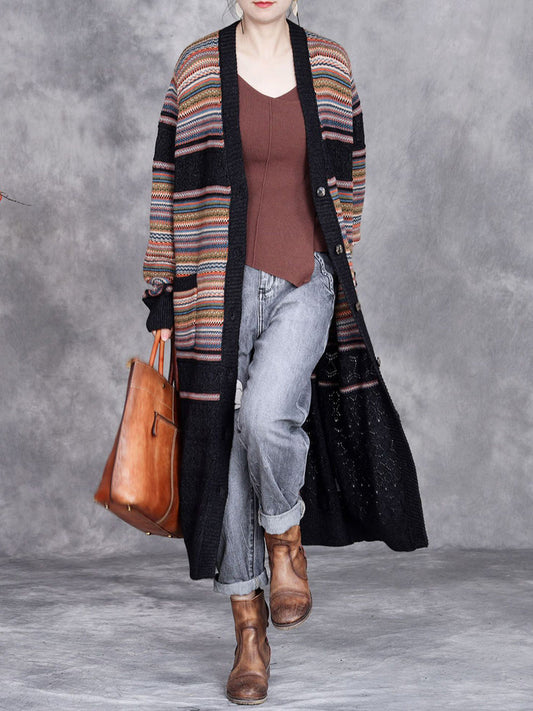 Women Autumn Stripe Colorblock Knitted Cardigan Coat