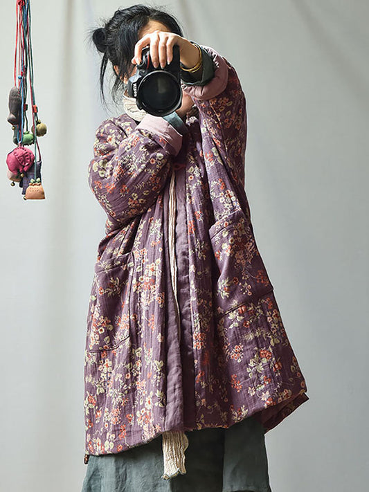 Plus Size - Retro Loose Warm Floral Pocket Coat