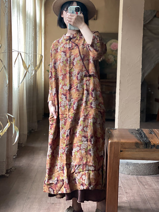 Women Vintage Floral Print Buckle Loose Cotton Robe Dress