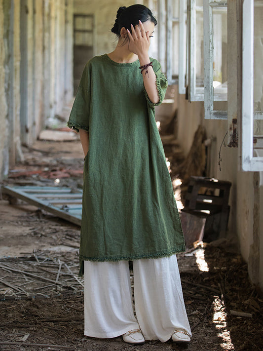 Women Casual Autumn Solid O-Neck Cotton Linen Dress