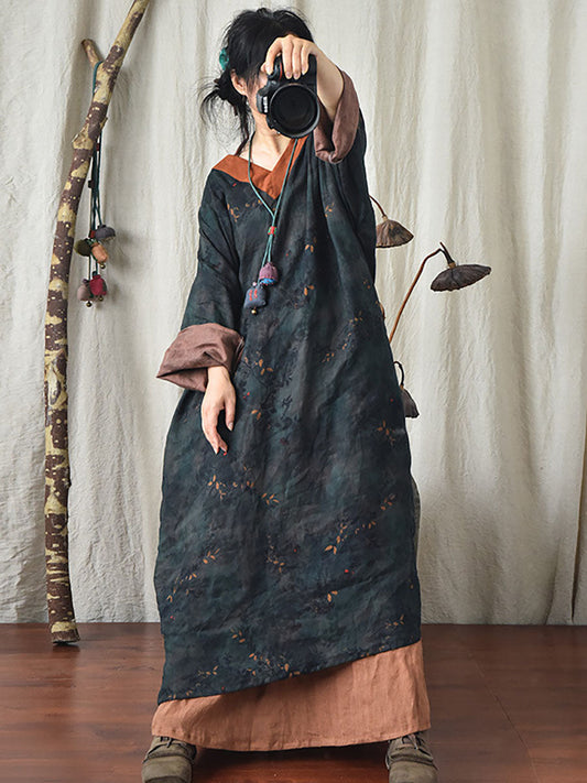 Women Loose Linen Print Vintage V-Neck Dress