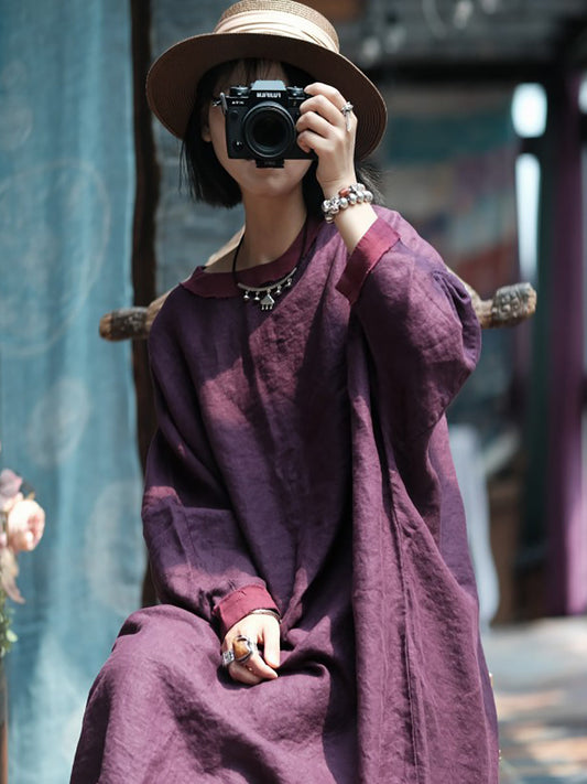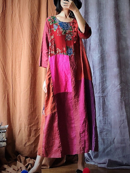 Women Autumn Vintage Colorblock Linen Dress