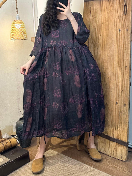 Plus Size Women Vintage Summer Ethnic Leaf Pleat Ramie Dress