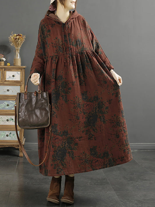 Plus Size Women Retro Floral Shirred Loose Hooded Dress