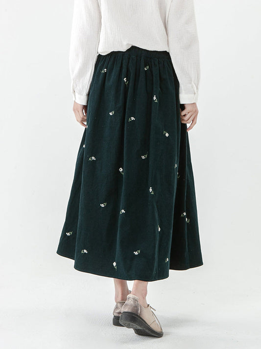 Plus Size Cotton Pocket Floral Elastic Waist Embroidered Skirt