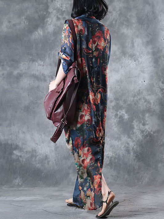 Plus Size Flower Printed Retro Split Hem Silk Dress