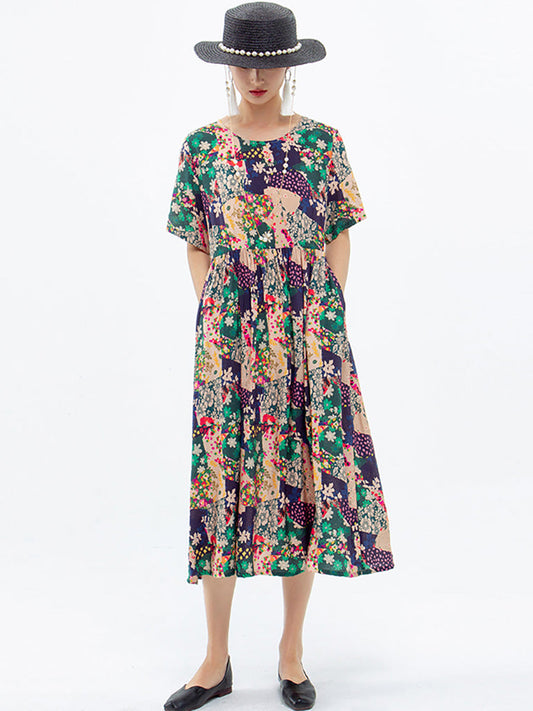 Women's Plus Size Floral Cotton Vintage Casual Loose Printing Maxi Dress
