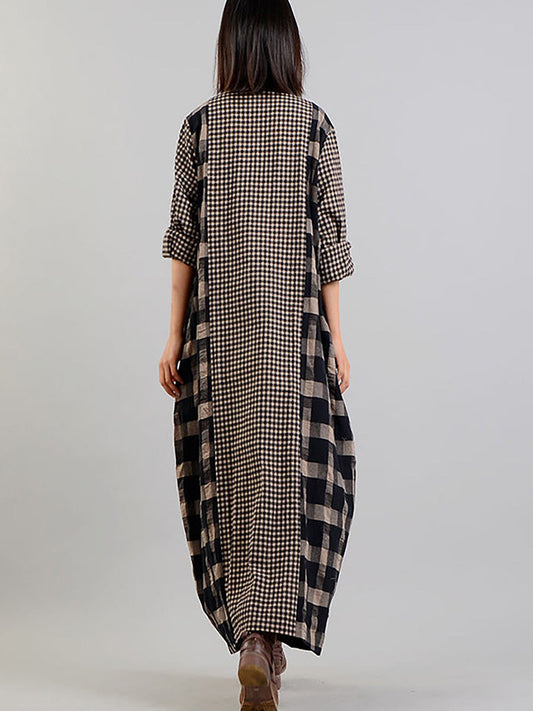 Plus Size Different Colored Plaid Retro Cotton Linen Dress