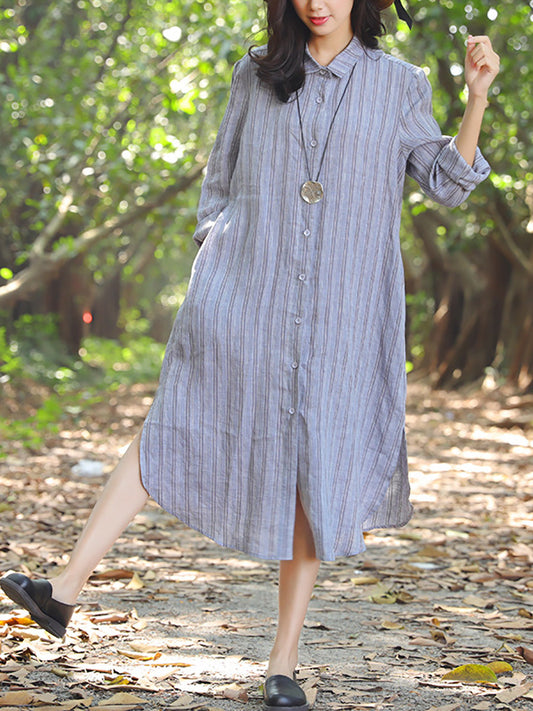 Plus Size Literature Side Slit Polo Collar Single Breasted Stripe Women Dress