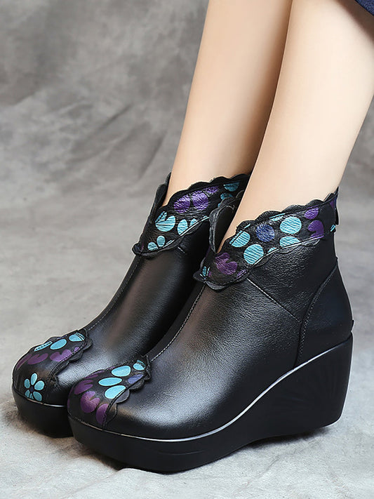 Women Winter Retro Leather Flower Spliced Ankle Boots