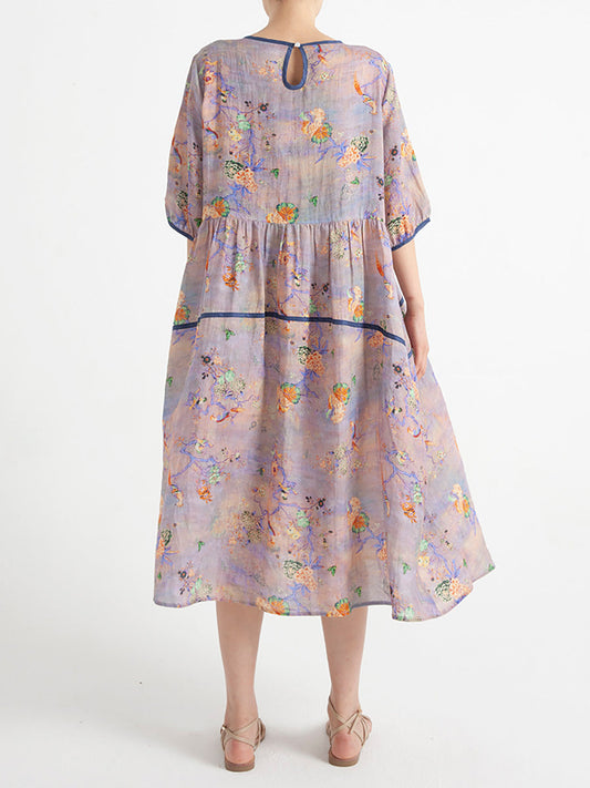 Plus Size Women Rerto Summer Print Loose Travel Ramie Dress