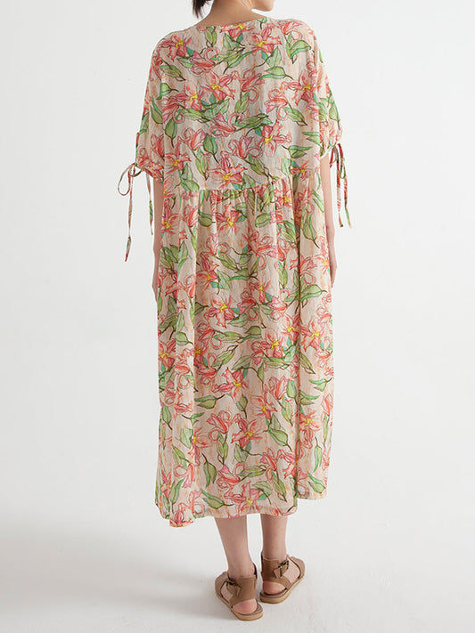 Plus Size Women Vintage Summer Floral Button Loose Ramie Dress