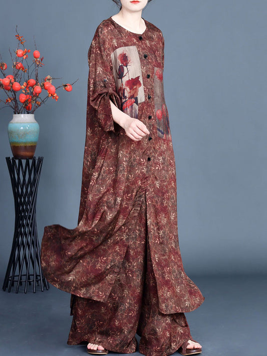 Women Vintage Spring Floral Spliced Shirt+Wide Leg Pants