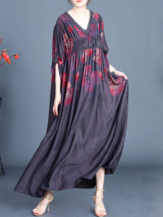 Women Spring Flower V-Neck Shirred Maxi Dress