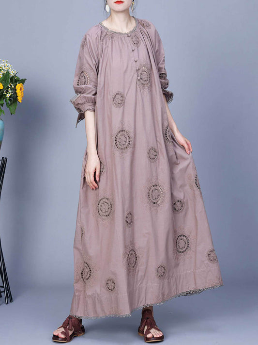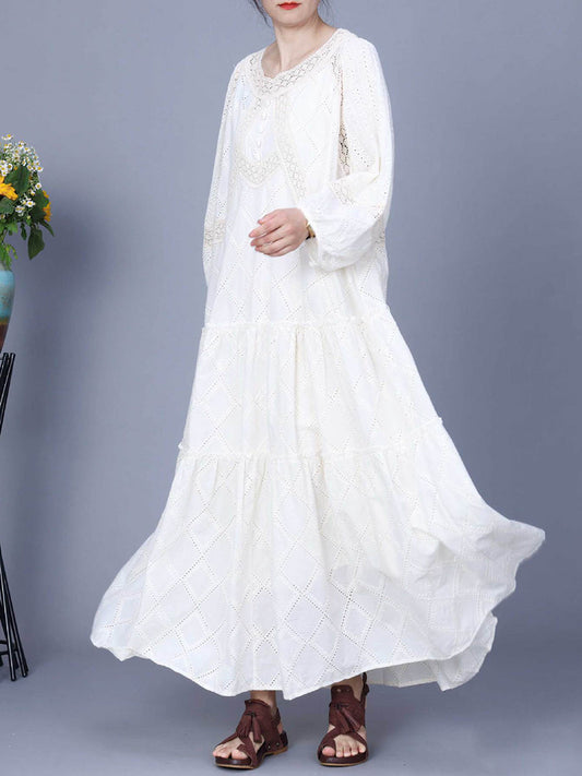 Women Artsy Spring Solid Embroidery Cotton Maxi Dress