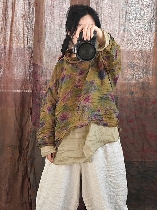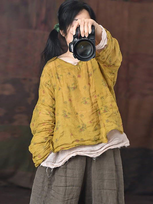 Women Vintage Floral Print V-Neck Ramie Shirt