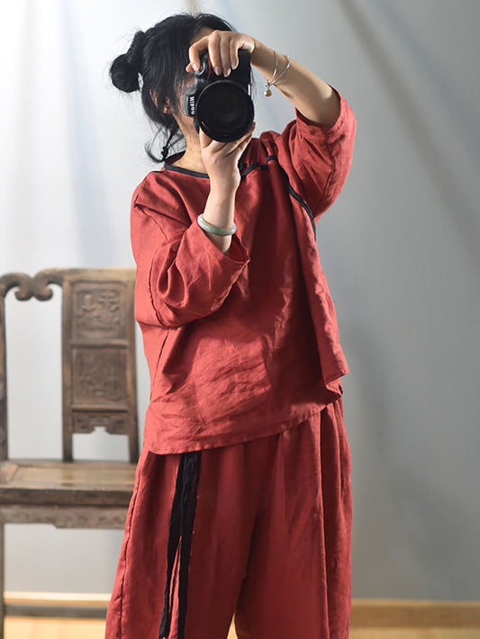 Plus Size Women Retro Spring Button O-Neck Linen Shirt