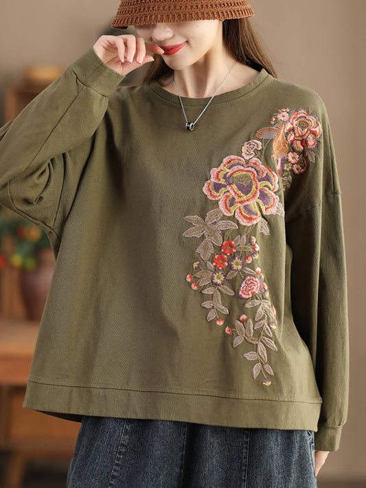 Women Vintage Spring Flower Embroidery O-Neck Shirt